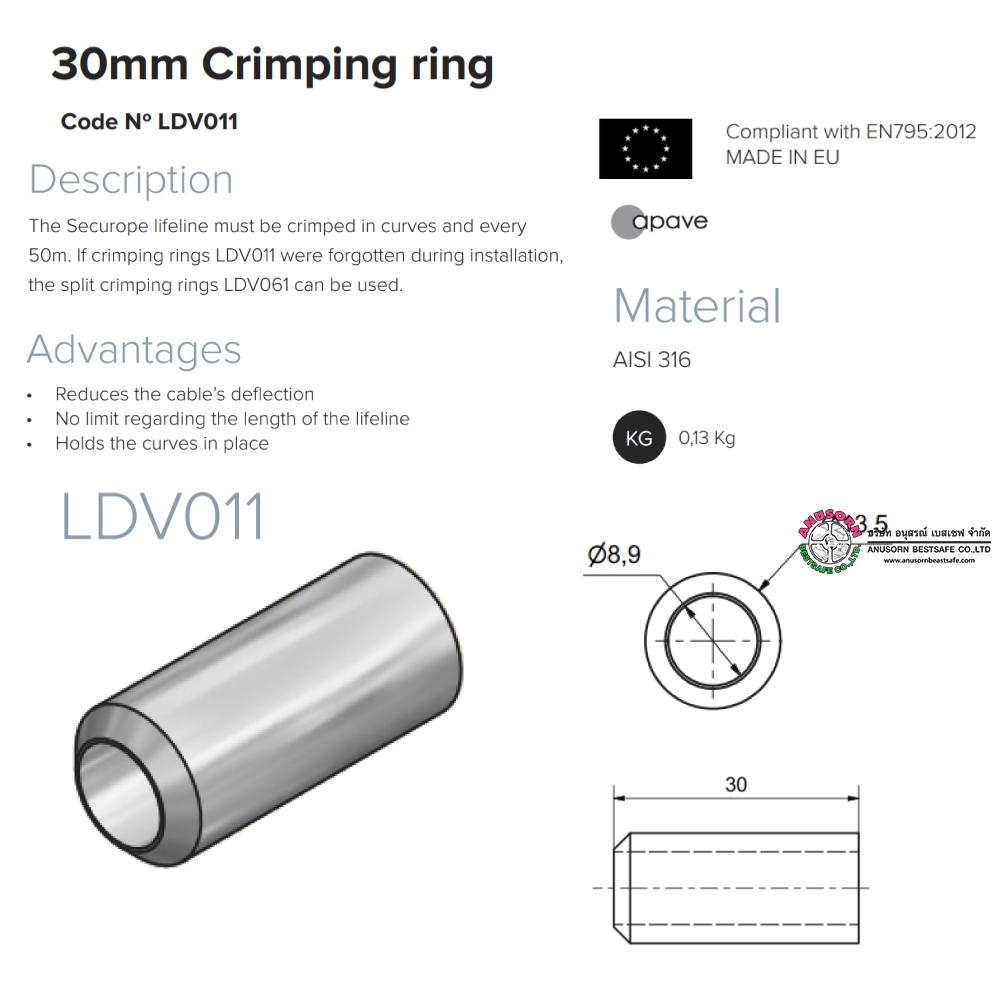 LDV011 Crimping ring length 30 mm AISI 316 and 304