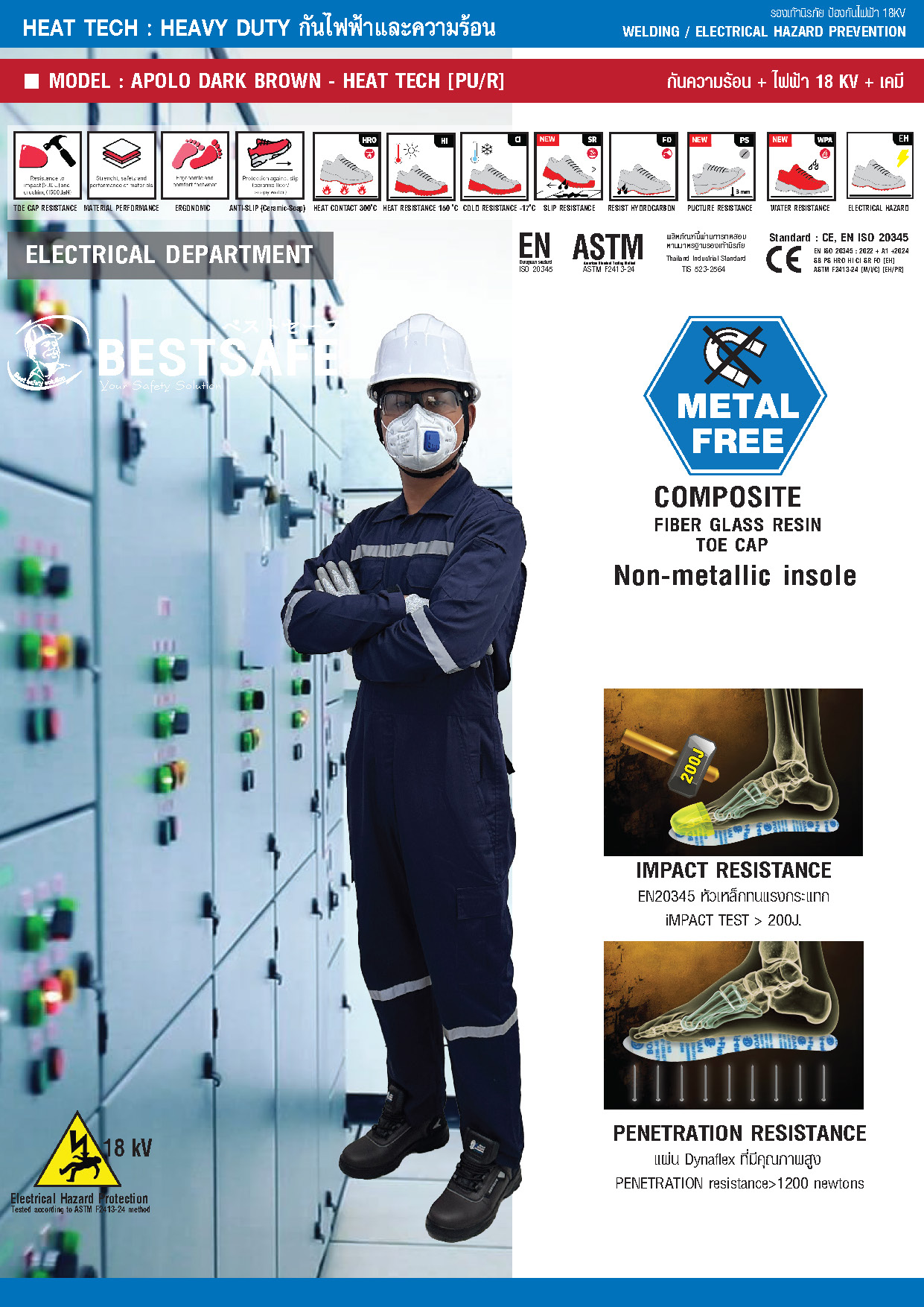 APOLO DARK BROWN -HEAT TECH [SB PS HRO HI CI SR FO EH] รองเท้านิรภัยหุ้มส้น สีน้ำตาลเข้ม พื้น PU/R ป้องกันไฟฟ้า 18 kV ยี่ห้อ BESTSAFE