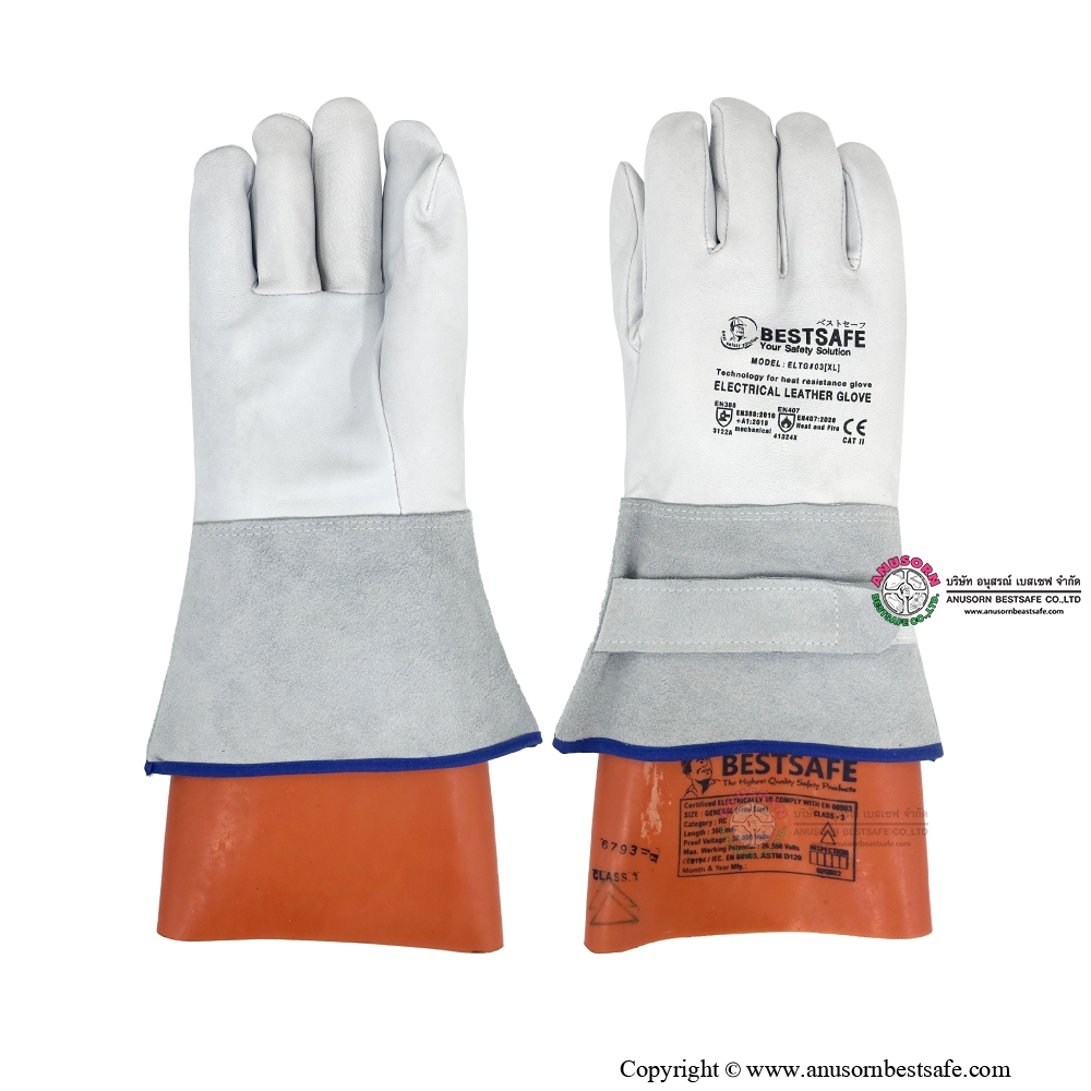 ELTG#03[XL] ยี่ห้อ BESTSAFE ถุงมือหนังสวมทับถุงมือกันไฟฟ้า ใช้งานร่วมกับถุงมืองกันกระแสไฟฟ้า CLASS 0,1,2,3 ได้สวมใส่กับถุงมือป้องกันไฟฟ้า Class ต่ำ (กระแสไฟฟ้าต่ำ)ถุงมือหนัง ELTG#03 Ref style E3 ช่วยในการปกป้องถุงมือยางจากสะเก็ดไฟ และป้องกันอันตรายบาดจากของมีคม ให้ความกระชับและความคล่องตัว เพื่อเพิ่มความสามารถในการป้องกันถุงมือกันไฟฟ้าที่เป็นยางธรรมชาติ ไม่ให้สัมผัสกับชิ้นงานไฟฟ้าที่มีความคมจนอาจทำให้ถุงมือไฟฟ้าเกิดการรั่วขาดได้ ป้องกันอันตรายจากของมีคม ให้ความกระชับและความคล่องตัว